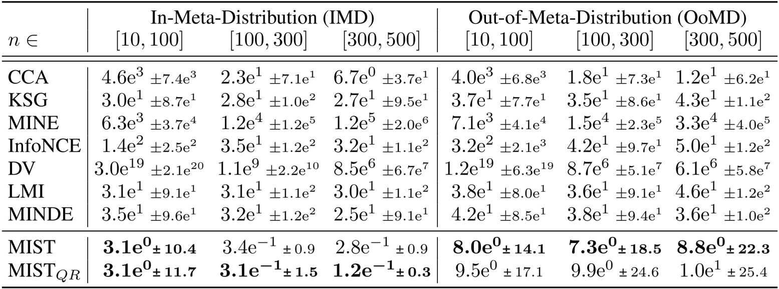 - 在高维和低样本环境中,模型表现出的损失比 KSG 基线低高达 100 倍,并避免了通常与估计大互信息值相关的负偏差。