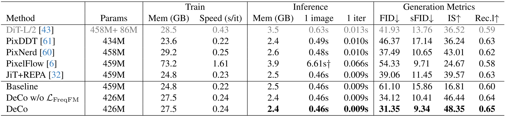 作者使用基线 DiT 模型并将其与 DeCo 框架进行比较,后者用像素解码器替换了最后两个 DiT 块。结果表明,DeCo 实现了显著更好的生成质量,将 FID 从 61.10 降低到 31.35,将 IS 从 16.81 提高到 48.35,同时保持了相当的训练和推理成本。