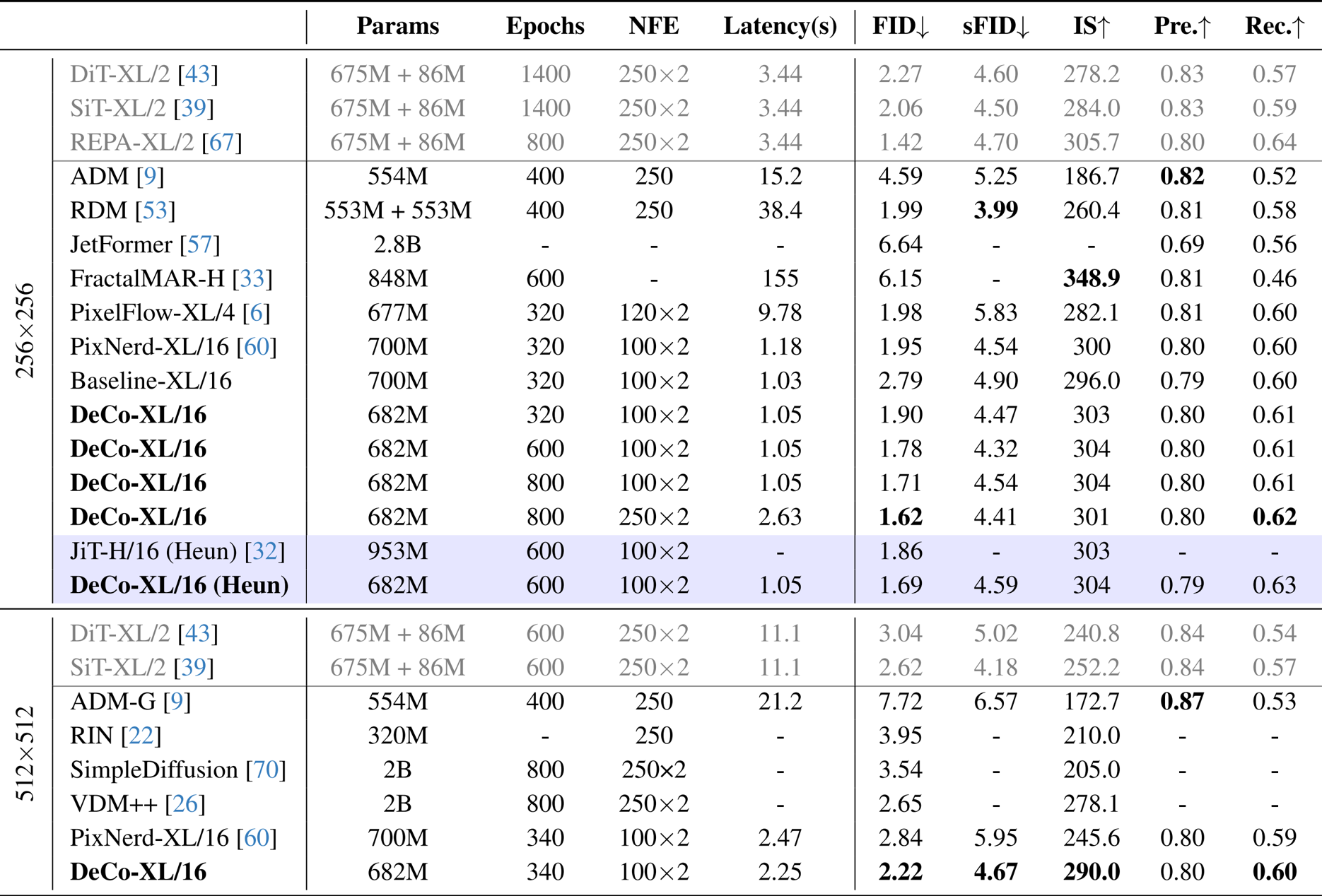- 增强的像素保真度: 通过消除对 VAE 压缩的依赖并专门化模型组件,DeCo 在 ImageNet 上实现了卓越的 FID 分数,有效地缩小了像素空间和潜在空间扩散模型之间的性能差距。