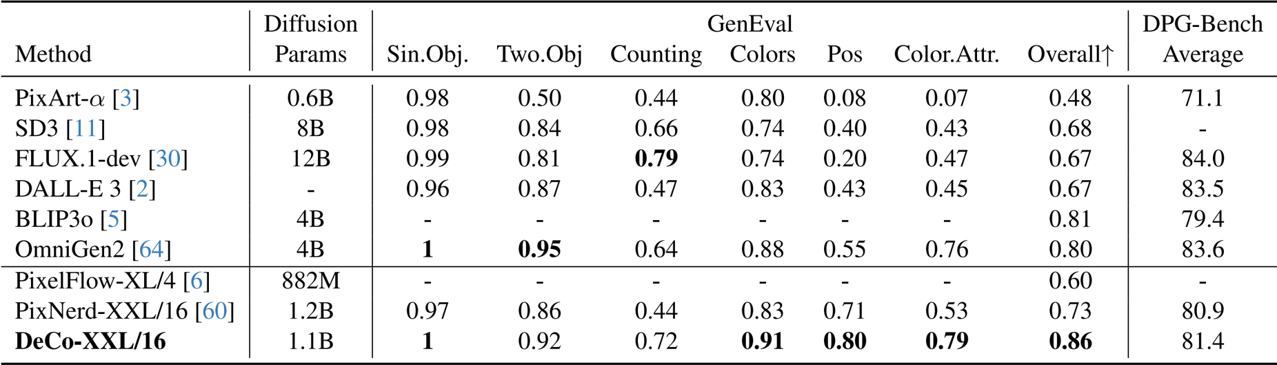 - 文本到图像生成: 在 GenEval 基准测试中,DeCo 获得了 0.86 的总分,优于 SD3、FLUX.1-dev 和 BLIP3o 等知名模型,以及 PixNerd 等像素扩散方法。