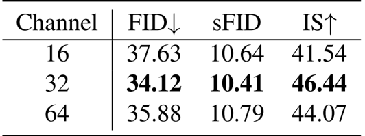 作者分析了像素解码器隐藏层大小对性能的影响,结果显示隐藏层大小为 32 时效果最佳,FID 为 34.12,sFID 为 10.41,IS 为 46.44。较小的大小(16)会导致性能降低,而增加到 64 则没有进一步的改善。