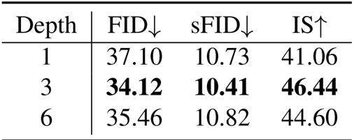 结果表明,像素解码器深度为 3 时性能最佳,FID 为 34.12,sFID 为 10.41,IS 为 46.44,优于更浅和更深的配置。