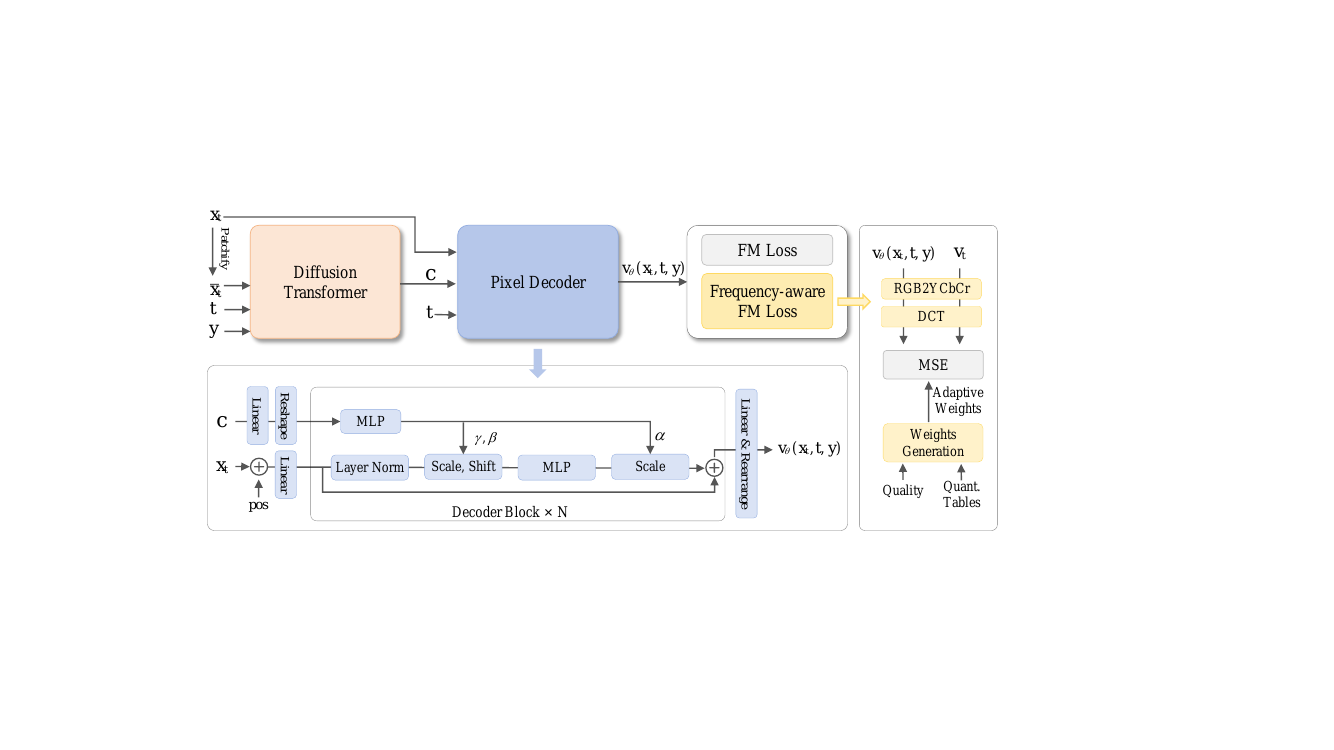 - 频率感知损失: 作者实现了一种受 JPEG 压缩启发的新型流匹配损失,该损失使用离散余弦变换 (DCT) 和自适应加权来优先考虑视觉上显著的频率,同时抑制难以察觉的高频噪声。