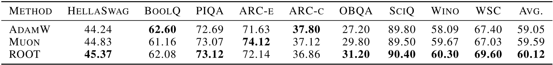 - 学术基准: 评估了 HellaSwag 和 PIQA 等任务的零样本性能;ROOT 取得了 60.12 的平均分,优于 Muon (59.59) 和 AdamW (59.05)。