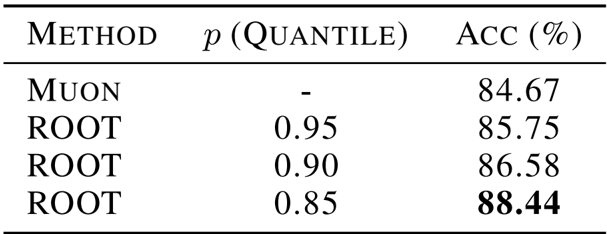 作者在 CIFAR-10 上训练的 Vision Transformer 上评估了不同百分位阈值对 ROOT 优化器中离群值抑制的影响。结果表明,阈值的选择显著影响性能,较低的 0.85 百分位产生了最高的准确率 88.44%,优于 Muon 基线和其他 ROOT 配置。这表明更积极的离群值抑制可以增强视觉任务的泛化能力。
