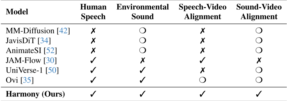 为了解决这些差距,作者推出了 Harmony,这是一个联合音视频生成框架,旨在生成从环境噪音到人类语音的高度同步内容。