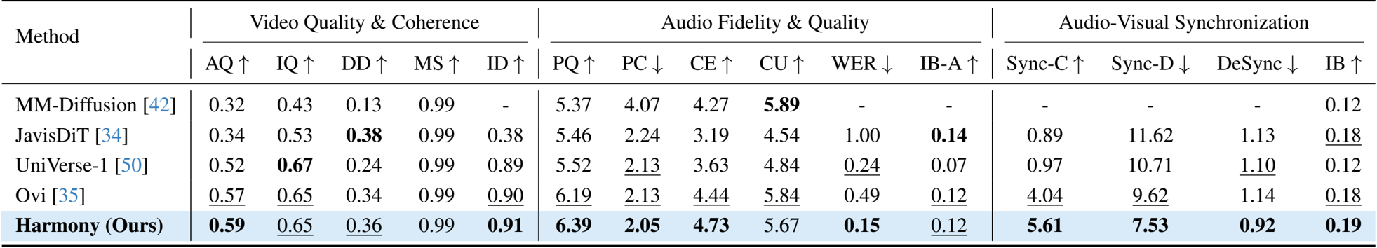 - 核心性能指标: 提出的 Harmony 模型在视听同步方面取得了最先进的结果,获得了 5.61 的 Sync-C 分数和 7.53 的 Sync-D 分数,显著优于基线,同时保持了具有竞争力的视频质量和音频保真度。