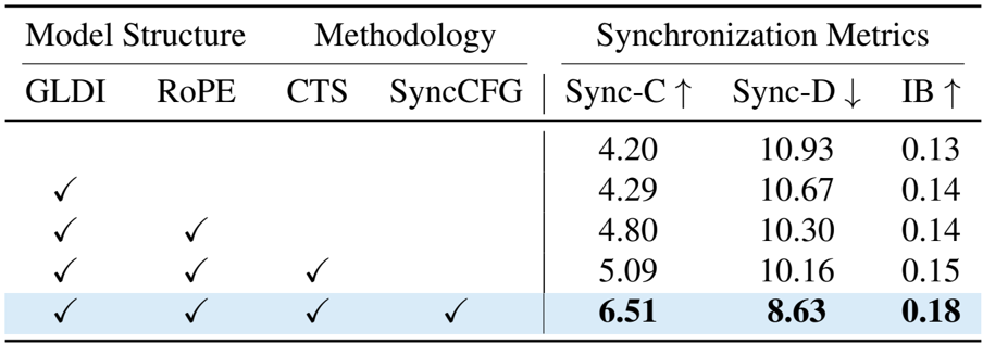 作者使用消融研究来评估其提出的组件对视听同步的影响。结果表明,添加全局-局部解耦交互 (GLDI) 模块改善了同步性,进一步集成 RoPE 对齐、跨任务协同 (CTS) 和同步增强 CFG (SyncCFG) 带来了持续的收益。包含所有组件的完整模型实现了最高的 Sync-C 分数 6.51 和最低的 Sync-D 分数 8.63,证明了每项贡献的有效性。