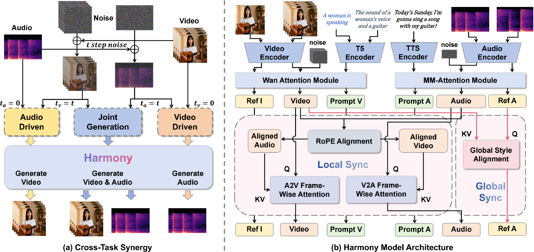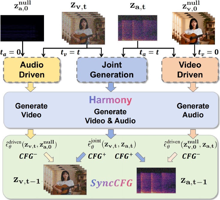 在生成式人工智能领域,同步音视频内容的合成是一项关键挑战,开源模型在实现稳健的音视频对齐方面仍面临诸多困难。我们的分析表明,这一问题根源在于联合扩散过程中的三个根本性挑战:(1)对应漂移(Correspondence Drift),即同时演化的噪声潜在表示阻碍了对齐关系的稳定学习;(2)全局注意力机制效率低下,难以捕捉细粒度的时间线索;(3)传统无分类器引导(Classifier-Free Guidance, CFG)存在的模态内偏差,虽增强了条件生成能力,却未能有效促进跨模态同步。为克服上述挑战,我们提出了一种名为 Harmony 的新框架,通过机制化手段强制实现音视频同步。首先,我们设计了一种跨任务协同训练范式(Cross-Task Synergy Training),利用音频驱动视频生成与视频驱动音频生成任务所提供的强监督信号,有效缓解对应漂移问题。其次,我们构建了一个全局-局部解耦交互模块(Global-Local Decoupled Interaction Module),实现高效且精确的时间风格对齐。最后,我们提出一种新型的同步增强型无分类器引导机制(Synchronization-Enhanced CFG, SyncCFG),在推理阶段显式分离并放大对齐信号。大量实验表明,Harmony 在生成质量与音视频同步精度方面均达到新的最先进水平,显著优于现有方法,尤其在实现细粒度音视频同步方面表现突出,为生成式多模态内容合成树立了新标杆。