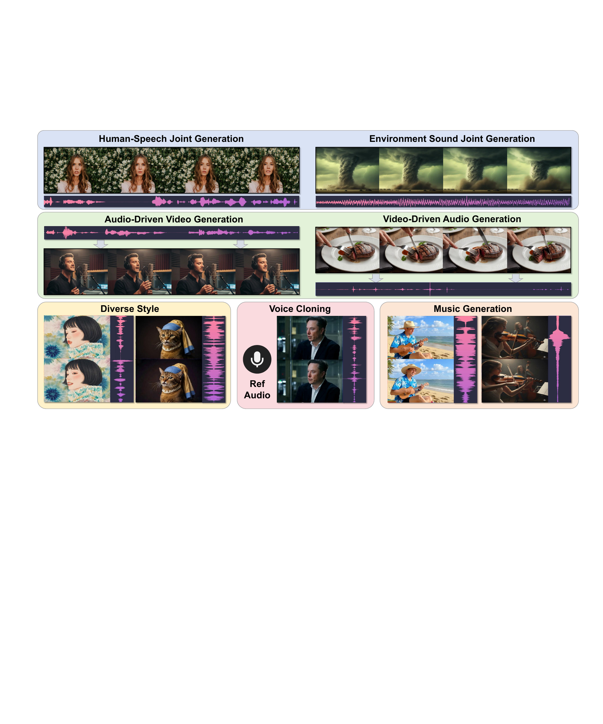 - 与最先进方法的定量比较: 在环境音、语音和复杂场景数据集上针对 MM-Diffusion、JavisDiT、UniVerse-1 和 Ovi 的评估验证了该模型在联合音视频生成方面的卓越性能。