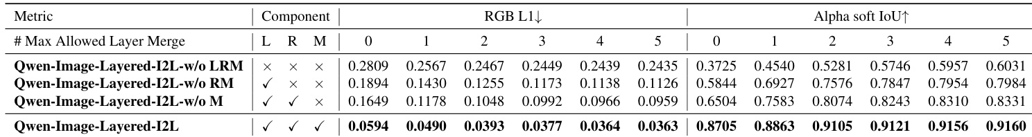 作者在不同图层合并约束下评估图像分解模型,结果表明包含所有组件(Layer3D RoPE、RGBA-VAE和多阶段训练)的完整模型性能最优,在所有合并设置下均取得最低RGB L1和最高Alpha soft IoU,证明其分解精度和alpha通道保真度优于消融版本.