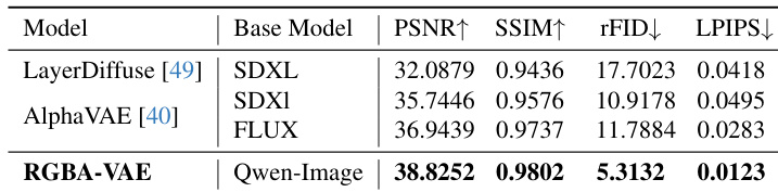 作者在AIM-500数据集上使用PSNR、SSIM、rFID和LPIPS指标评估RGBA图像重建. 结果表明RGBA-VAE在所有指标上均优于LayerDiffuse和AlphaVAE,取得最高PSNR和SSIM,同时报告最低rFID和LPIPS,表明其重建保真度和感知质量更优.