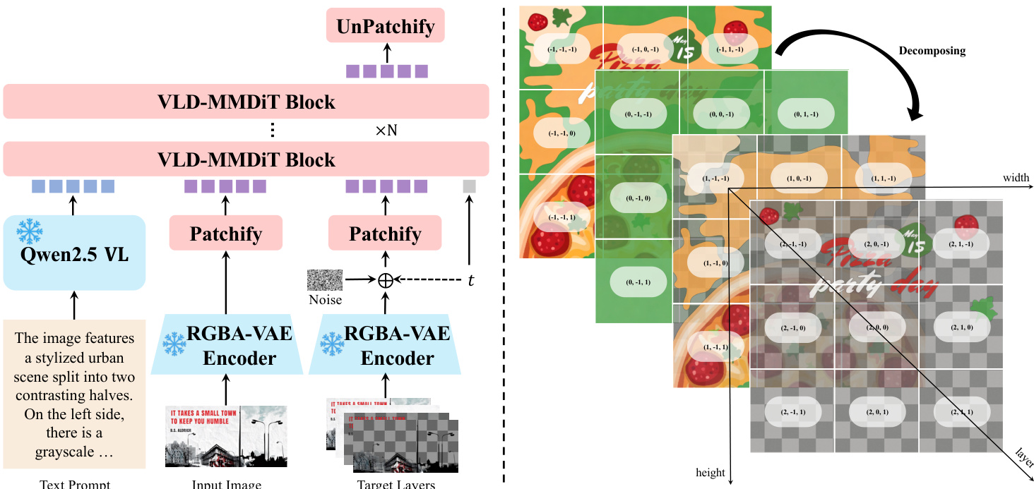 作者采用新型端到端扩散框架Qwen-Image-Layered,将单张RGB输入图像 I∈RH×W×3 分解为 N 个语义解耦的RGBA图层 L∈RN×H×W×4,其中每层 Li=[RGBi;αi] 包含颜色分量和alpha通道。原始图像通过序列alpha混合重建: