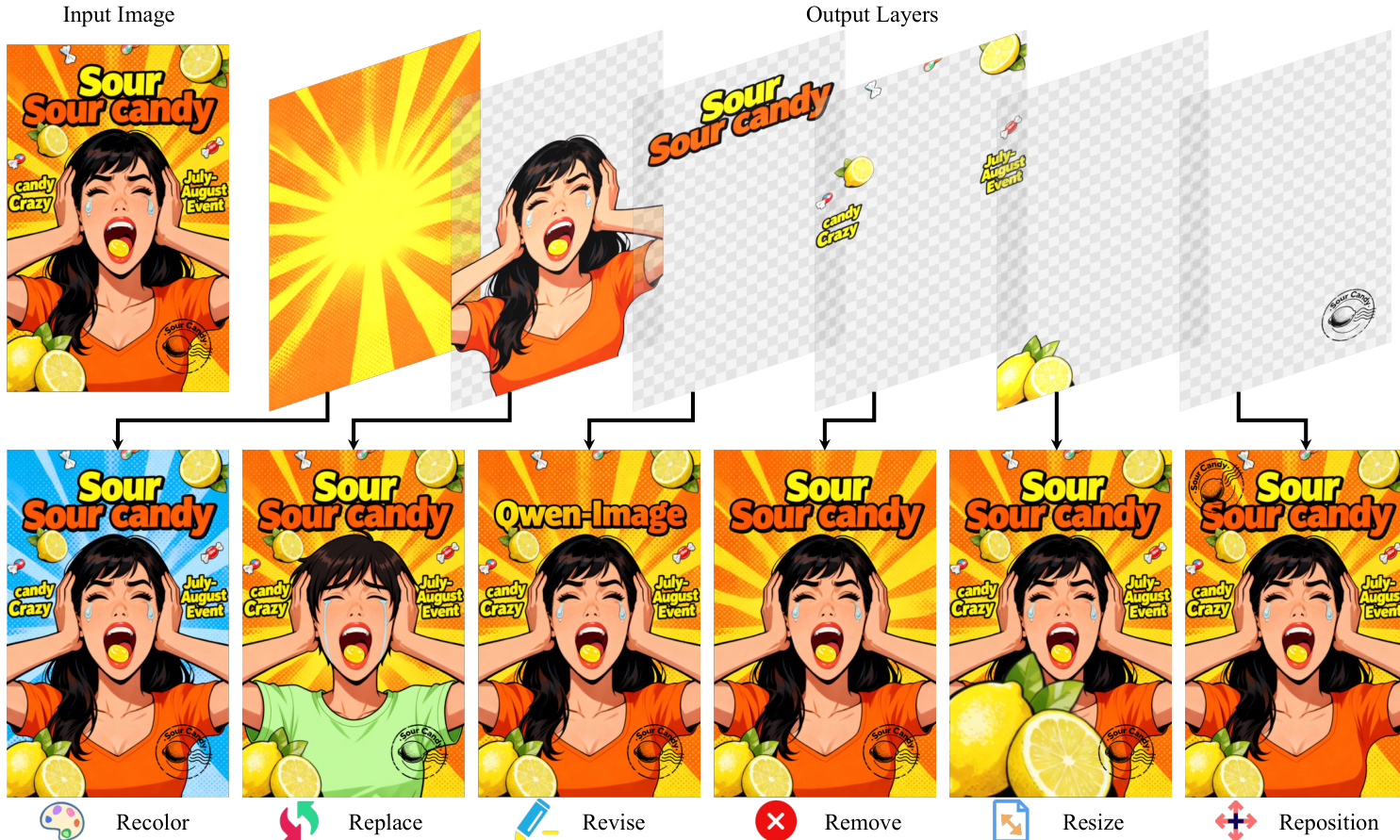 C0=0Ci=αi⋅RGBi+(1−αi)⋅Ci−1i=1,…,N其中 CN=I. 该分解实现固有可编辑性:每层可独立修改(重着色、缩放、重定位或移除)而不影响其他内容,图层操作视觉示例已验证此能力.