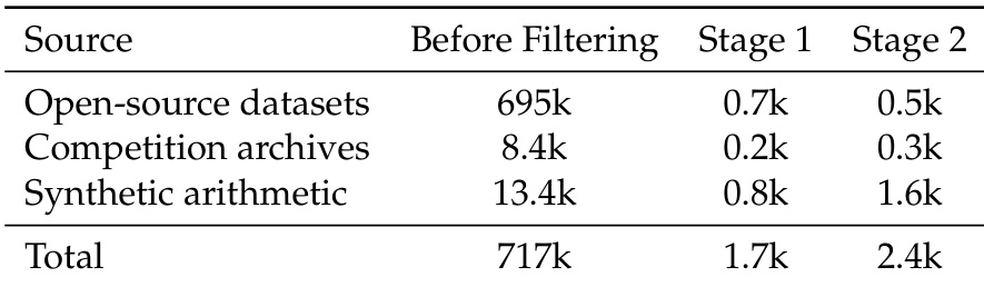 - 过滤后的开源与竞赛问题与合成算术集合并,再通过强提议模型进行基于准确率的筛选,以选择非平凡、非退化问题,作为课程设计的一部分。