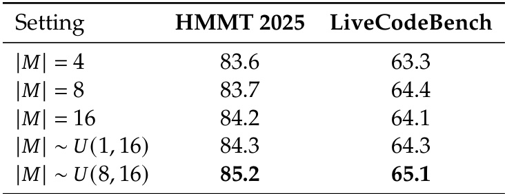 作者使用表格分析消息集大小对模型性能的影响,结果显示推理过程中调整消息集大小可提升结果。实验表明,在HMMT 2025和LiveCodeBench上,采用8至16之间的均匀采样消息集大小可获得最高准确率,优于固定大小设置。
