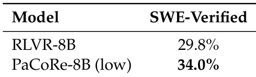 作者对比RLVR-8B与PaCoRe-8B(低)在SWE-Verified基准上的表现,结果显示PaCoRe-8B(低)达到34.0%的解决率,显著优于RLVR-8B的29.8%。该结果表明,PaCoRe框架可在无需任务特定调优的情况下实现对软件工程任务的强泛化能力。