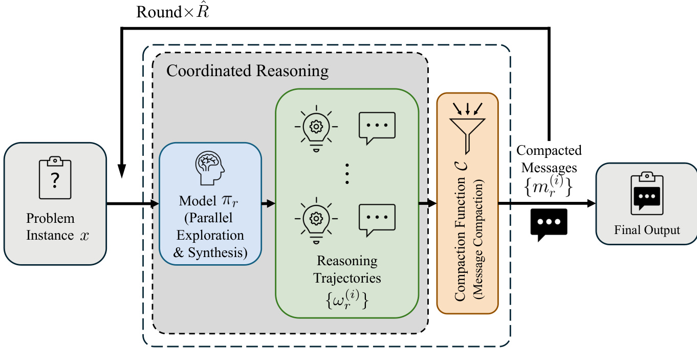 - PaCoRe提出了一种新框架,通过在多轮并行推理轨迹间实现迭代式消息传递,将测试时计算(TTC)扩展能力与固定上下文窗口限制解耦,使有效TTC可在标准上下文范围内扩展至数百万token。
