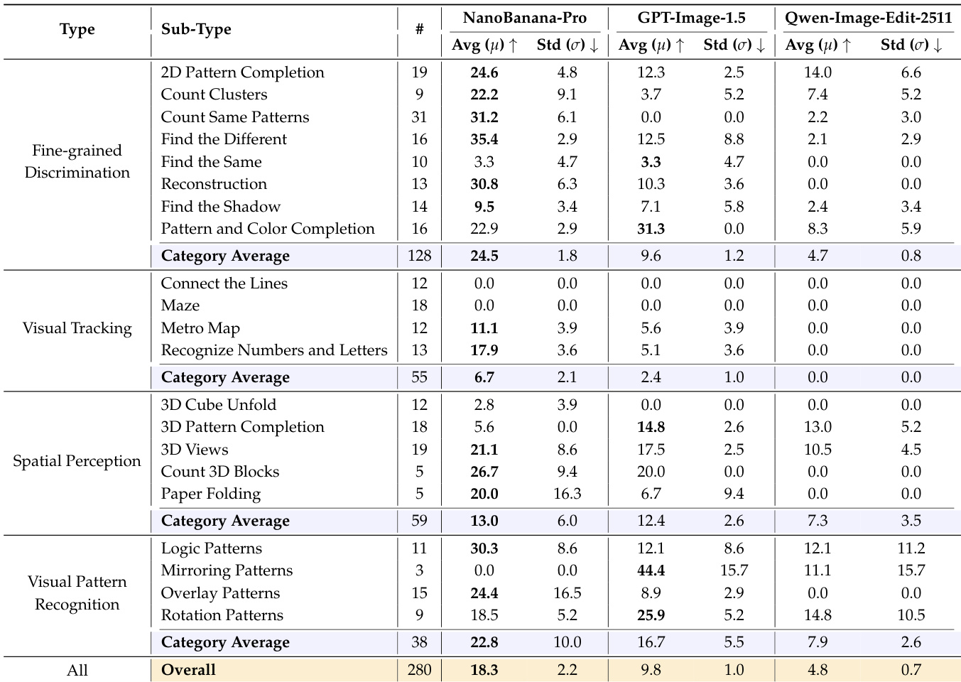 作者在BABYVISION-GEN基准上评估三种视觉生成模型,NanoBanana-Pro以18.3%的总体准确率位居第一,显著优于GPT-Image-1.5(9.8%)和Qwen-Image-Edit(4.8%)。结果表明,所有模型在需要连续空间追踪的任务(如迷宫导航、连线追踪)上表现极差,准确率降至0%,而在细粒度区分和视觉模式识别子类型上表现较强。