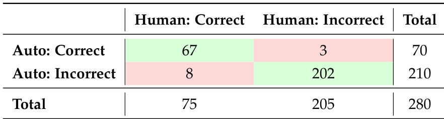 作者通过对比人工判断评估其自动化评估方法在BABYVISION-GEN上的可靠性。结果显示,自动裁判与人工评估在96.1%的实例上达成一致,F1分数高达0.924,表明两种评估方式具有高度一致性。