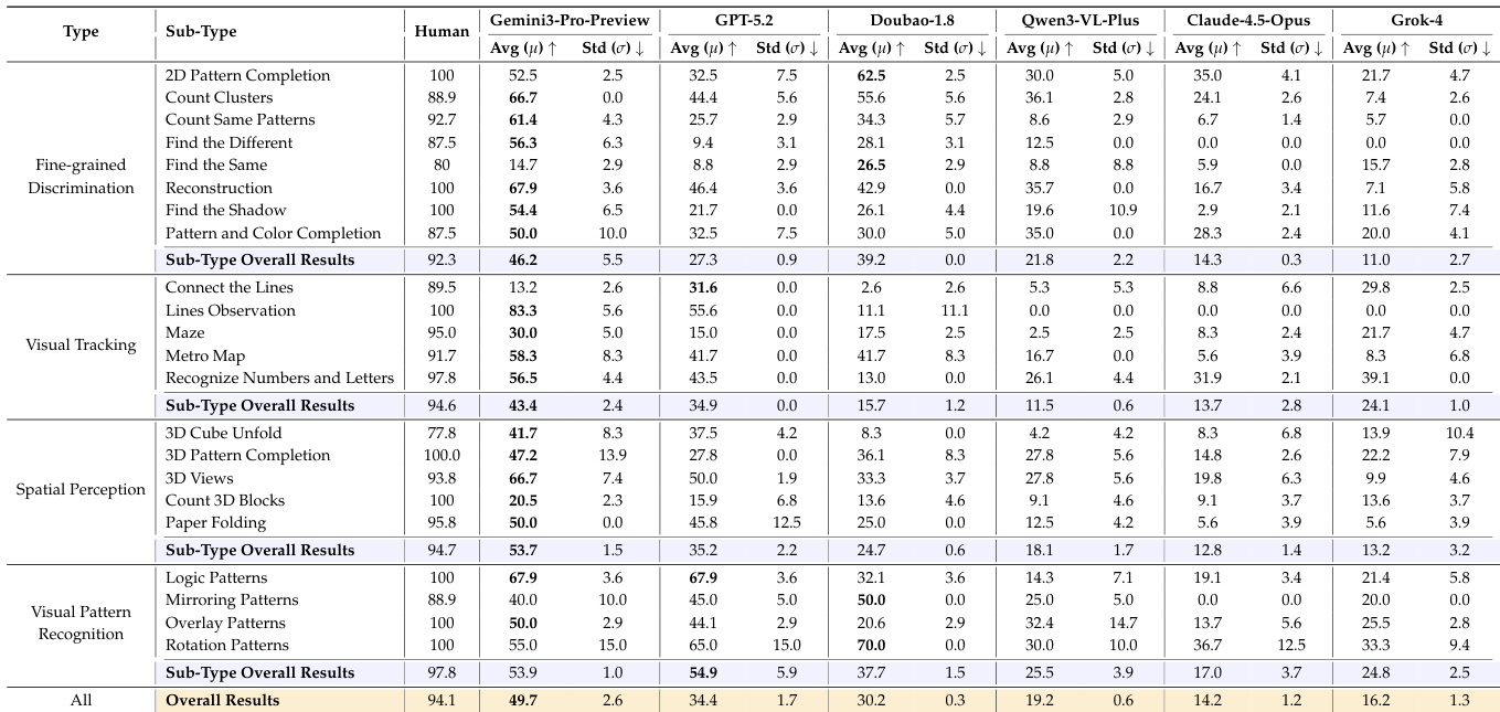 - 在BabyVision上,专有模型最高达49.7% Avg@3(Gemini3-Pro-Preview),远低于人类基准(94.1%),在细粒度区分(最佳:Find the Same任务中26.5%)、视觉追踪(Lines Observation任务中接近零)和3D空间感知(Count 3D Blocks任务中最佳20.5%)方面持续失败。