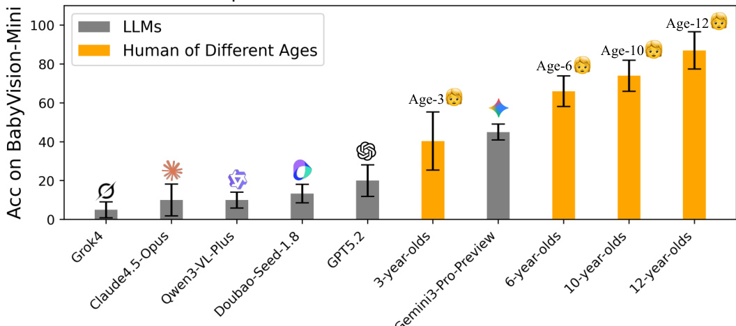 研究表明,最先进的多模态大语言模型(MLLMs),包括Gemini3-Pro-Preview,在BABYVISION上的准确率仅为49.7%,远低于人类基准(6岁儿童:约70%,成人:94.1%),暴露出尽管在语言密集型多模态任务中表现优异,但基础视觉原语仍存在严重缺陷。