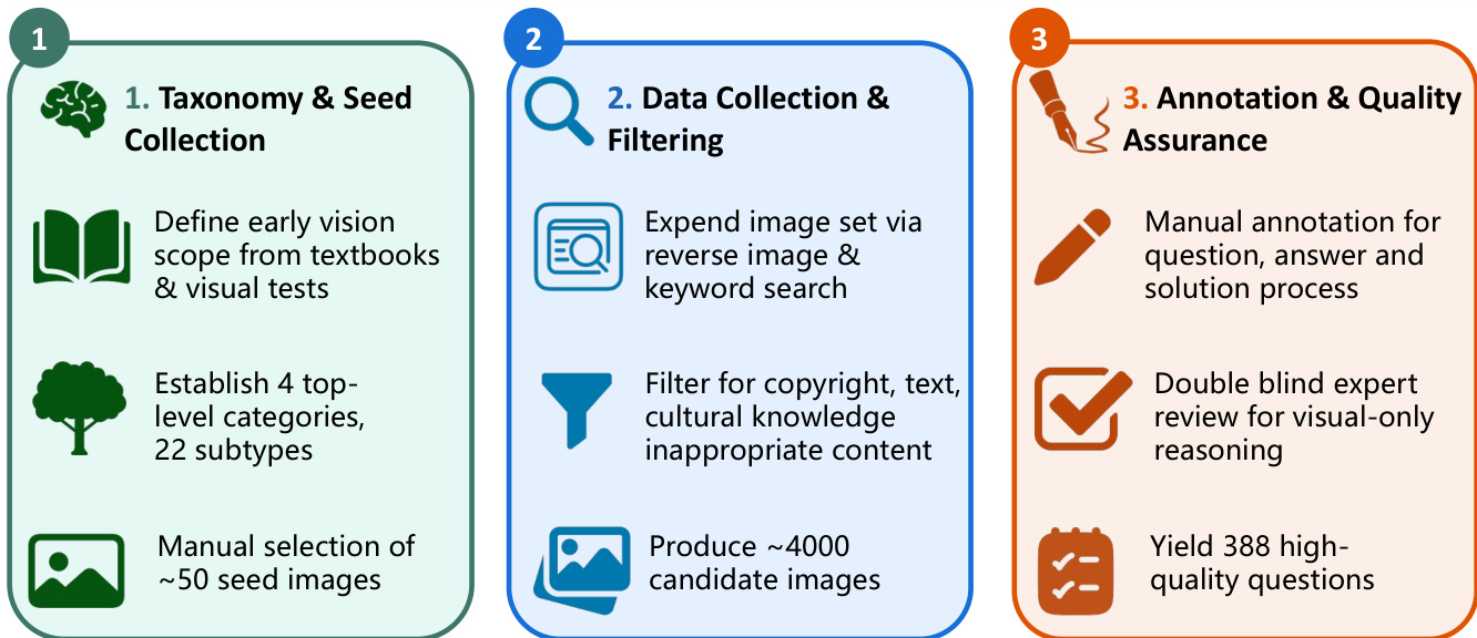 - 数据集通过三阶段策划流程构建:(1) 分类体系定义与种子选择,手动挑选100张高质量种子图像,代表每个子类型;(2) 数据收集与过滤,利用反向图像搜索和关键词检索获取约4,000张候选图像,并严格过滤含文字、文化知识或不当内容的样本;(3) 标注与质量保障,由训练标注员创建问题与详细解题过程,随后进行双盲专家评审,确保答案具有视觉基础且无歧义。