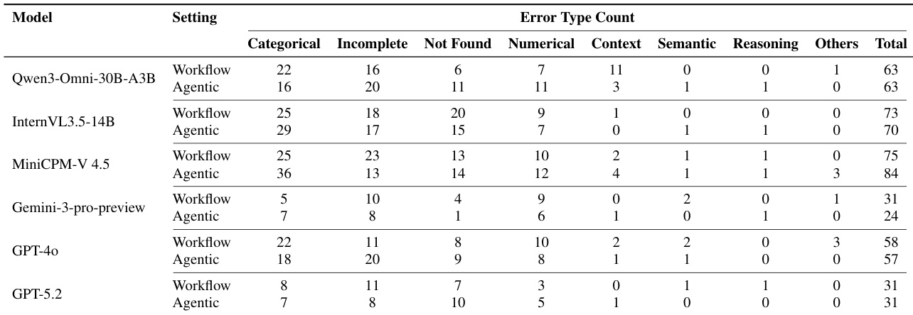 - 错误分析:类别错误在各模型中占主导,尤其在代理模式下更为显著,源于早期感知错误未被纠正;数值错误在所有模型中持续存在,代理模式未带来显著改善。