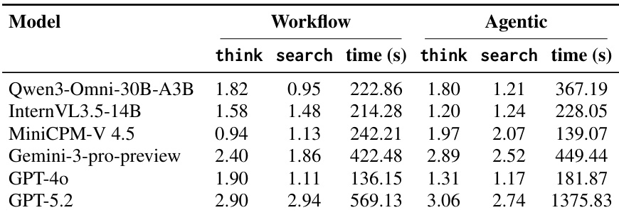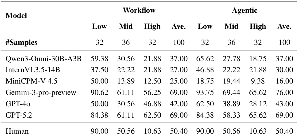 结果表明,对于Gemini-3-pro-preview与GPT-5.2等顶级模型,代理范式性能优于工作流范式,准确率分别提升7%与0%;而Qwen3-Omni-30B-A3B与MiniCPM-V 4.5等表现较弱的模型在代理模式下未见提升,甚至出现性能下降。两种范式下,随着难度增加,性能均显著下降,且人类表现始终高于所有模型,尤其在高难度样本上差距明显。