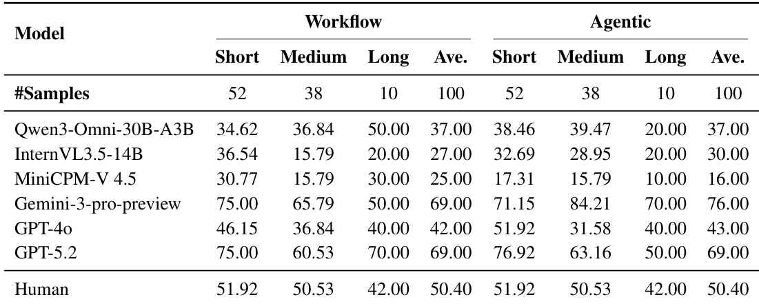 结果表明,在工作流与代理范式下,模型性能随视频时长变化显著,Gemini-3-pro-preview在所有类别中均取得最高准确率。代理模式在长视频上普遍优于工作流,尤其对Gemini-3-pro-preview而言,其在长视频上的准确率从50.00%提升至70.00%,而开源模型如Qwen3-Omni-30B-A3B与MiniCPM-V 4.5在代理模式下长视频上的准确率则大幅下降。