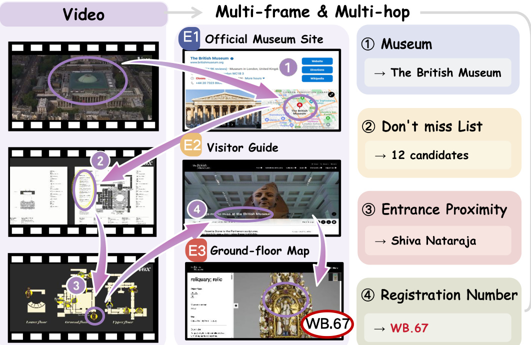 - 每个问题设计均遵循两个核心约束:(1) 多帧推理——要求证据来自多个帧,而非单张截图;(2) 多跳推理——需具备可分解的推理路径,将视频感知与外部网络搜索相连接。