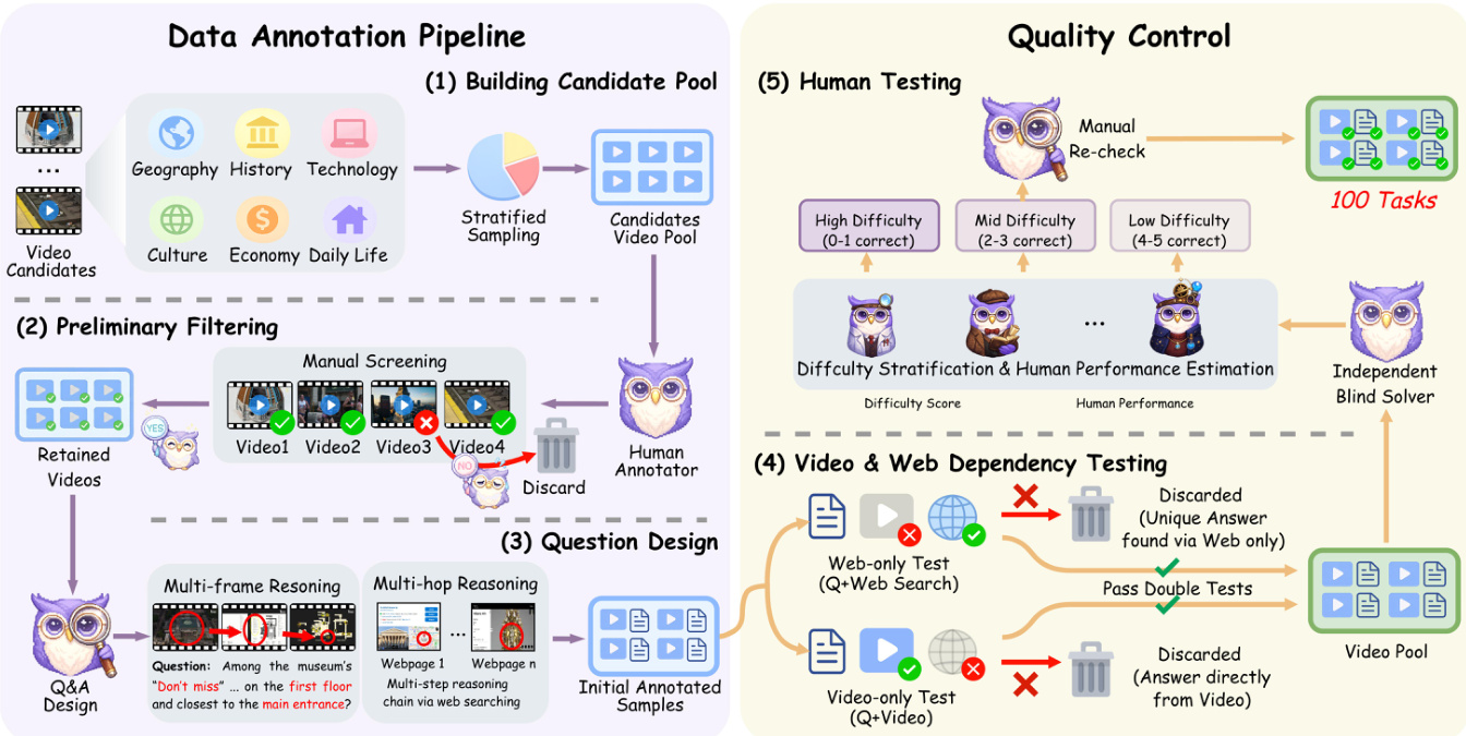 为确保标注数据的可靠性和有效性,实施了严格的两阶段质量控制流程。第一阶段为“视频与网络依赖性测试”,评估问题答案是否可仅从视频中得出,或是否必须依赖外部网络信息。仅允许需借助网络推理的视频保留,而可直接从视频提取答案的样本被剔除,从而确保数据集强调多跳推理。第二阶段为“人工测试”,由人工标注者评估每项任务的难度并预估人类表现。任务按预期正确回答数分为高、中、低三个难度等级,阈值分别为0–1、2–3、4–5个正确答案。该分层机制支持构建复杂度均衡的数据集。此外,对100个任务样本进行了人工复核,进一步验证标注质量与一致性。
