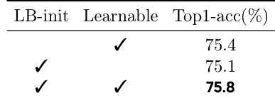 作者在 DeiT-T 上比较了不同变体,评估其初始化策略和可学习参数对多头混合的影响。结果表明,仅使用局部性偏置初始化即可获得强性能,加入可学习系数后进一步提升准确率,两者结合时达到最佳效果。