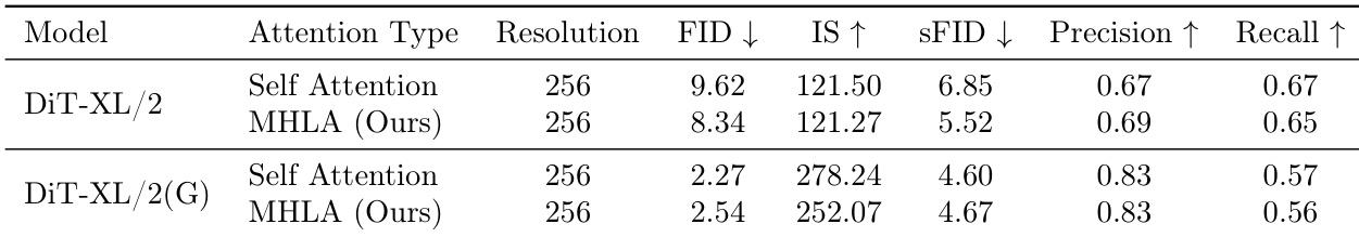 作者在 DiT-XL/2 上将 MHLA 与自注意力进行对比,用于类别到图像生成。结果显示,MHLA 在保持竞争力的 IS 和精度的同时,FID 和 sFID 分数更低。在无分类器引导下,MHLA 仍与自注意力表现相当,证明其在高分辨率图像生成中的有效性。