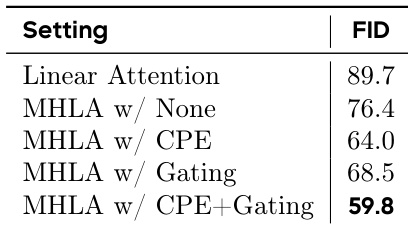 作者评估了在类别到图像生成中额外模块对 MHLA 的影响,结果表明结合 CPE 和门控机制可将 FID 降低至 59.8,优于所有其他变体。这表明包含两个模块的完整 MHLA 配置实现了最佳生成质量。
