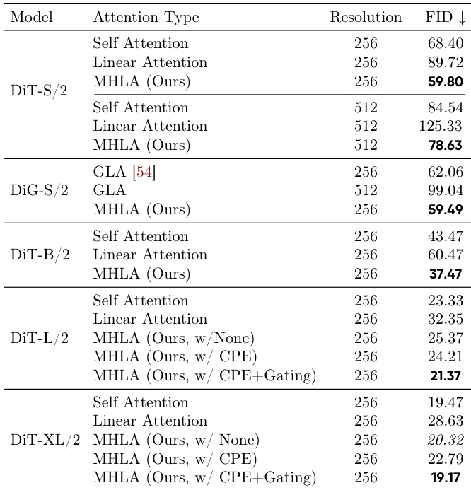 作者在 DiT 和 DiG 模型上评估了所提出的 MHLA 方法在图像生成任务中的表现,与自注意力和线性注意力基线进行对比。结果表明,MHLA 在所有模型规模和分辨率下均取得最佳 FID 分数,持续优于线性注意力,同时保持高吞吐量,并在更大规模下匹配或超越自注意力性能,无需依赖 CPE 等额外模块。