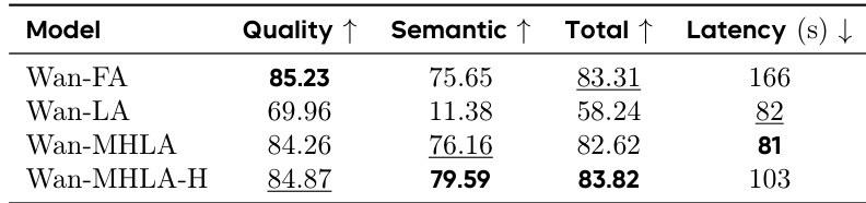 作者通过微调预训练的 Wan2.1-1.3B 模型评估 MHLA 在视频生成中的表现,将其 FlashAttention 替换为 MHLA。结果表明,MHLA 在保持相同延迟的前提下,显著优于原始线性注意力,恢复了与原模型相当的性能,并实现 2.1 倍的推理加速。
