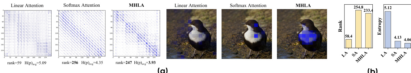 - 主实验验证 MHLA 通过在保持线性时间复杂度的同时保留查询条件的标记级多样性,缓解了线性注意力中的全局上下文坍缩问题。