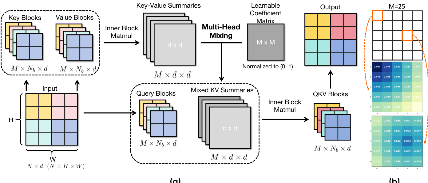 系数矩阵 Mc 的初始化设计倾向于局部性,初始系数 mi,j(0)∝1−dist(i,j)/maxk(dist(i,k)),促进稳定且快速收敛。该局部性偏置初始化在图中可视化,系数被重塑为二维网格以展示块之间的空间关系。最终输出通过查询块与混合键值摘要之间的块内矩阵乘法生成,得到大小为 M×Nb×d 的最终输出张量。这一两阶段过程——通过混合系数进行块级选择,再通过核内积进行块内重加权——重新引入了查询条件选择性和逐标记加权,这些在全局线性注意力中已丢失。MHLA 的整体复杂度仍为序列长度 N 的线性,因为主要操作为分块摘要计算和 M 个 d×d 矩阵的线性组合。