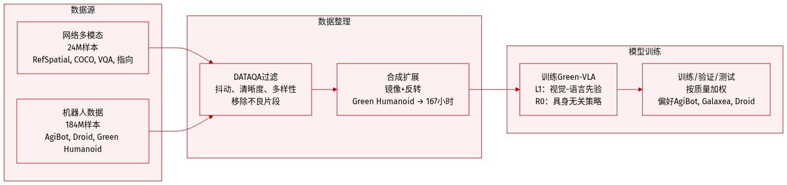 • Green-VLA 引入了一种以数据质量驱动的流水线,结合 DATAQA 过滤器和时序对齐,处理 3,000 小时异构机器人演示数据,确保在不同机器人形态和控制类型下稳定、高保真训练。