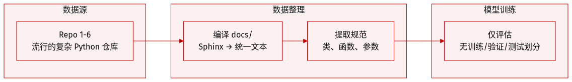 • 他们通过使用 Sphinx 编译每个仓库的 docs/ 目录中的源文件,将 reStructuredText 或 Markdown 转换为统一文本格式,捕获类、函数与模块定义,构建文档数据集。