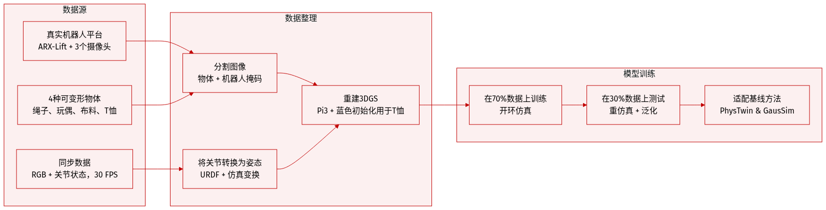 作者在 ARX-Lift 平台上收集真实世界机器人操作数据,包含四种可变形物体:绳子、玩偶、布料和 T 恤。每个物体有 30–40 个序列,每序列 100–150 帧,以 640×480 分辨率和 30 FPS 采集,同时同步记录机器人关节状态。数据集按 7:3 划分为训练集和测试集。