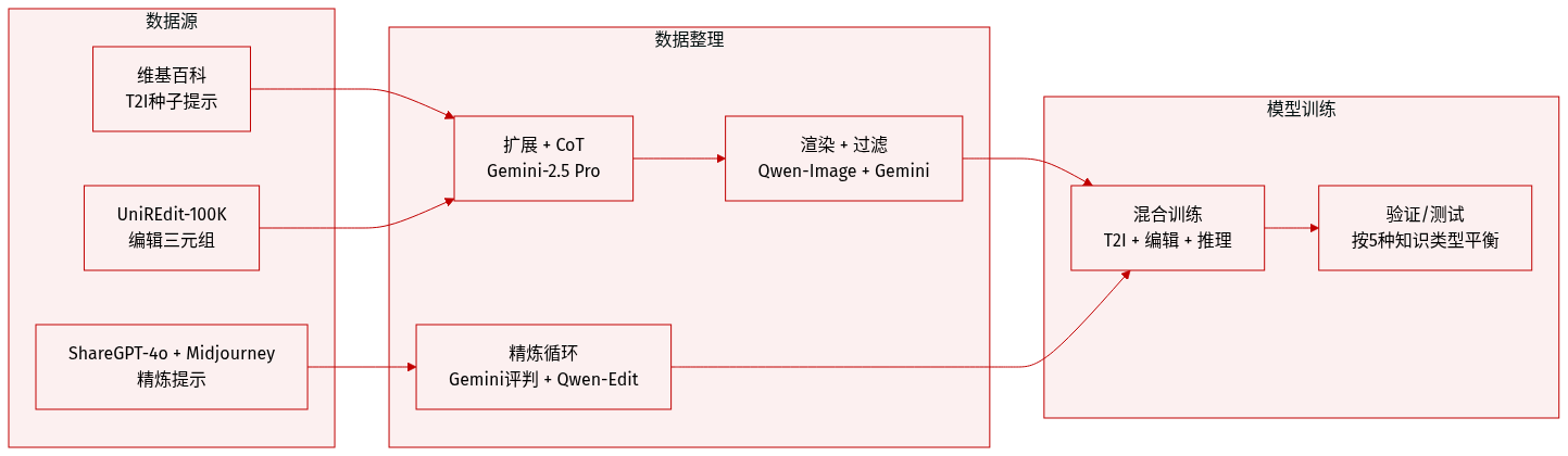 - 从 Wikipedia 获取种子提示,从 UniREdit-Data-100K 获取编辑三元组,从 ShareGPT-4o-Image 与 Midjourney 提示中获取优化训练数据。