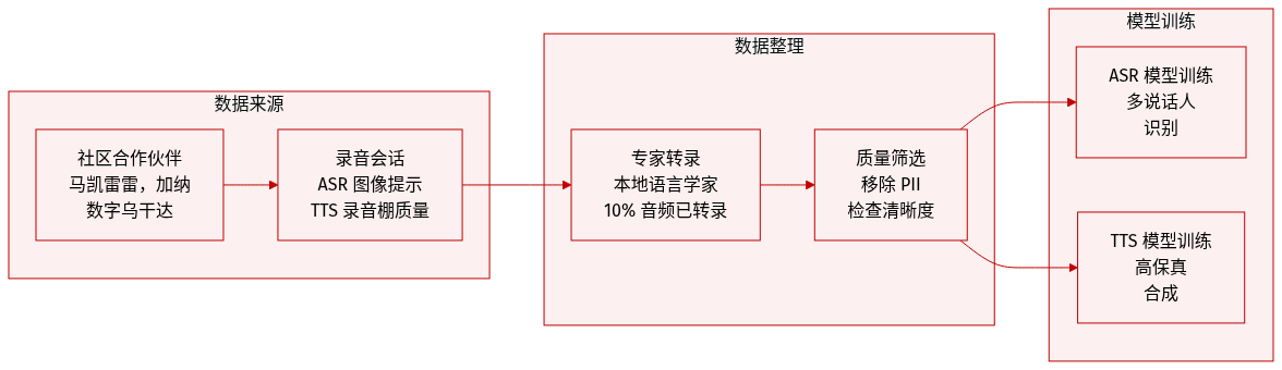 为了解决撒哈拉以南非洲语言面临的巨大数字鸿沟,WAXAL 提供了一个大规模、开放可访问的语音语料库,涵盖 24 种语言,代表超过 1 亿使用者。该语料库包含约 1,250 小时用于自动语音识别(ASR)的转录自然语音,以及超过 235 小时用于文本转语音(TTS)的高质量单人录音,内容为阅读语音平衡脚本。该项目与四家非洲学术和社区组织合作开发,并在 CC-BY-4.0 许可下发布,以促进研究、推动包容性技术发展并支持数字保存。
