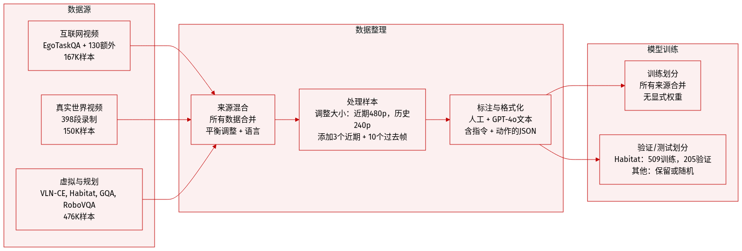 - 本地环境数据:398 个真实世界以自我为中心视频 → 150,214 样本。