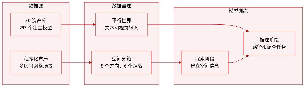 - 数据集构成和来源: 作者利用 N 乘 M 网格上的程序生成多房间室内布局,而非静态真实世界数据。视觉资产源自 Objaverse 库并使用 ThreeDWorld 模拟器渲染。