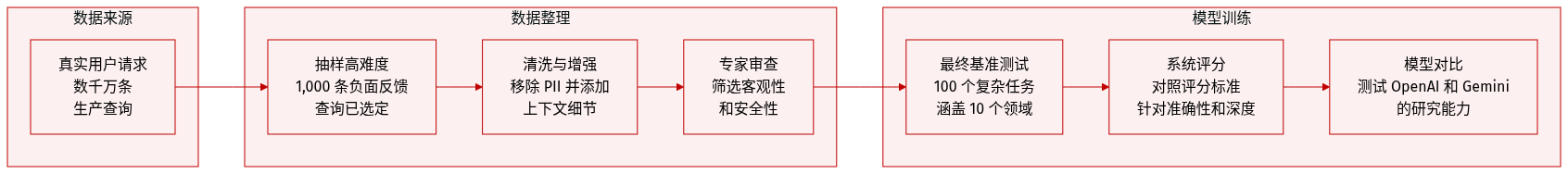 作者利用多阶段流水线构建和评估具有挑战性的深度研究任务,旨在反映真实世界的复杂性并确保高质量输出。该框架始于阶段 1:采样,其中从多样化的来源中抽取数千万潜在深度研究查询的大池,以实现广泛覆盖并反映真实世界使用的分布。此阶段从一个月生产窗口中选择 1,000 个样本子集,专注于固有具有挑战性的任务。