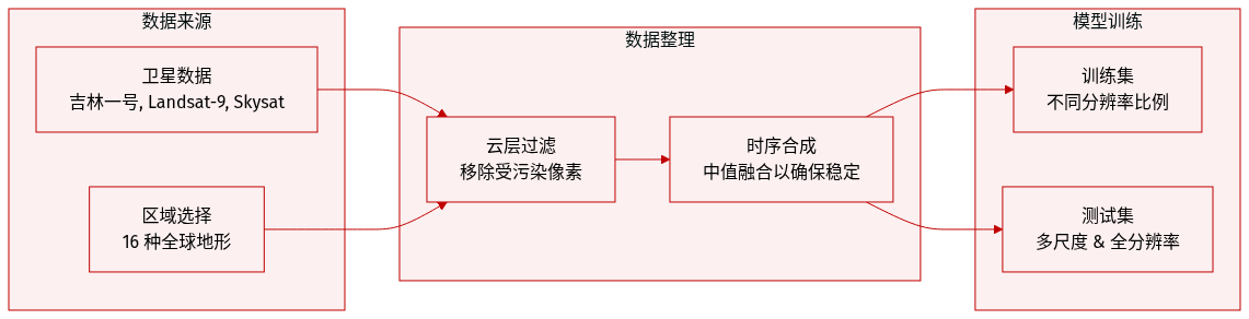 - 组成与来源: 作者利用 Google Earth Engine 获取了来自吉林一号、Landsat-9 和 Skysat 卫星的多源遥感数据。他们选择了全球 16 个地理多样化的区域,涵盖城市、山区、海洋和沙漠等地形。