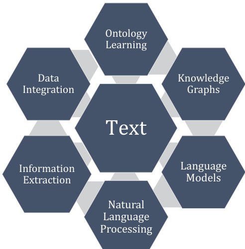 作者提出了一个综合的文本数据集成框架,将本体学习(OL)定位为将非结构化文本转换为结构化知识图谱(KGs)的核心机制。如中央框架图所示,该方法集成了各种自然语言处理组件,包括信息抽取、语言模型和数据集成,以促进稳健的推理和数据管理。