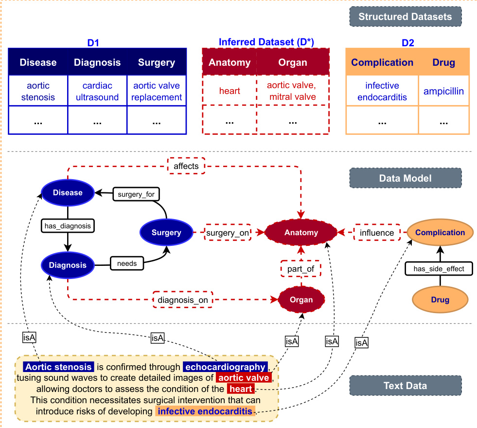 为了表示这些数据,作者主张将信息建模为具有动态模式的知识图谱,利用 RDF、RDFS 和 OWL 等表示语言。这提供了简单数据图所缺乏的高级抽象和推理能力。最终的数据模型将结构化数据集与从文本中推导出的推断数据集成,通过 surgery_for 或 affects 等定义的关系链接疾病、手术和解剖结构等实体。